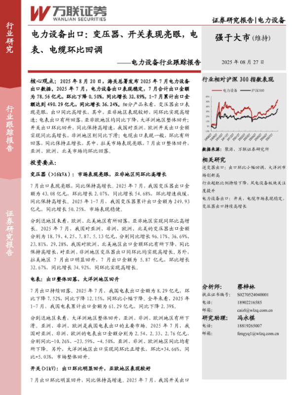 【万联证券】【202507】电力设备出口:开关、电缆市场表现稳定,变压器出口持续高增长-10页 证券期货研究报告