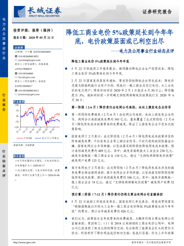 【长城证券】【20200522】电力及公用事业行业动态点评:降低工商业电价5%政策延长到今年年底,电价政策层面或已利空出尽-3页 行业研究