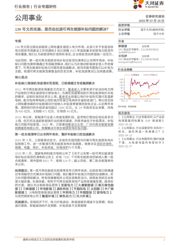 【天风证券】【202507】公用事业行业专题研究:136号文的实施,是否会加速可再生能源补贴问题的解决?-10页 证券期货研究报告