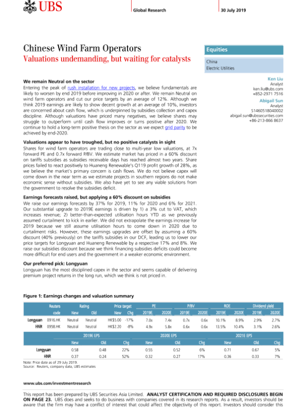 【瑞银】【20190730】中国风电场运营商:估值不高,但需要催化剂-29页 行业研究