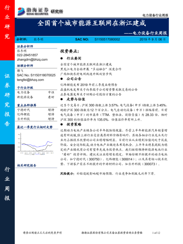 【渤海证券】【20190906】电力设备行业周报:全国首个城市能源互联网在浙江建成-12页 行业研究