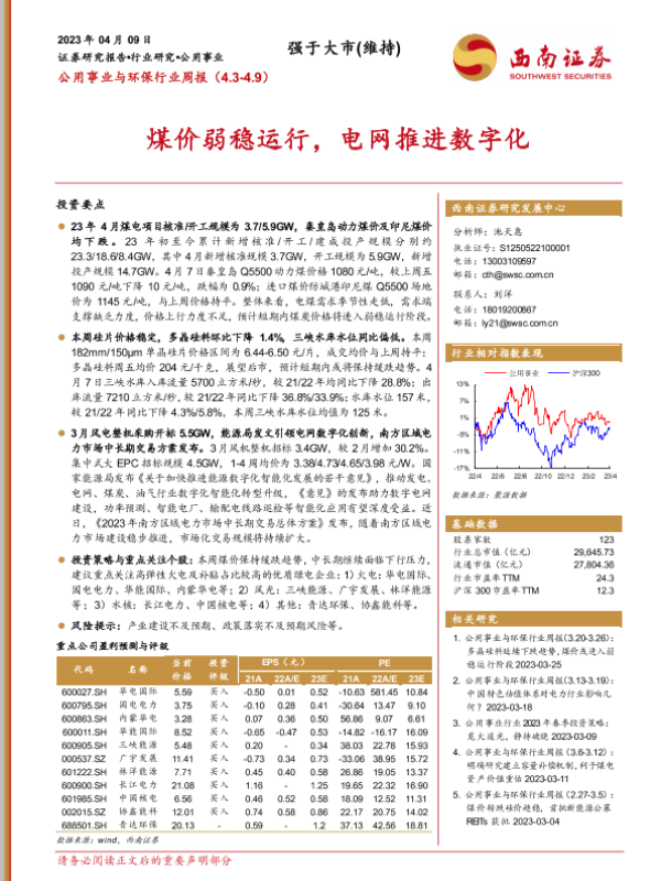 【西南证券】【20230409】公用事业与环保行业周报:煤价弱稳运行,电网推进数字化-21页 行业研究