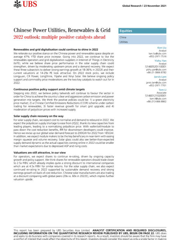 【瑞银】【20211123】中国公用事业行业-2022年的前景:未来有多个积极的催化剂-29页 行业研究