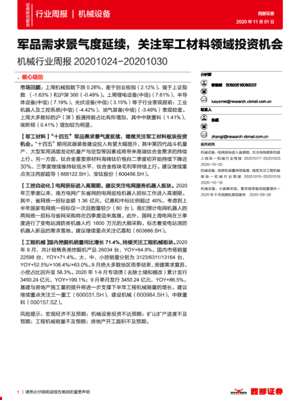 【西部证券】【20201101】20201101-西部证券-机械行业周报:军品需求景气度延续,关注军工材料领域投资机会-11页 行业研究