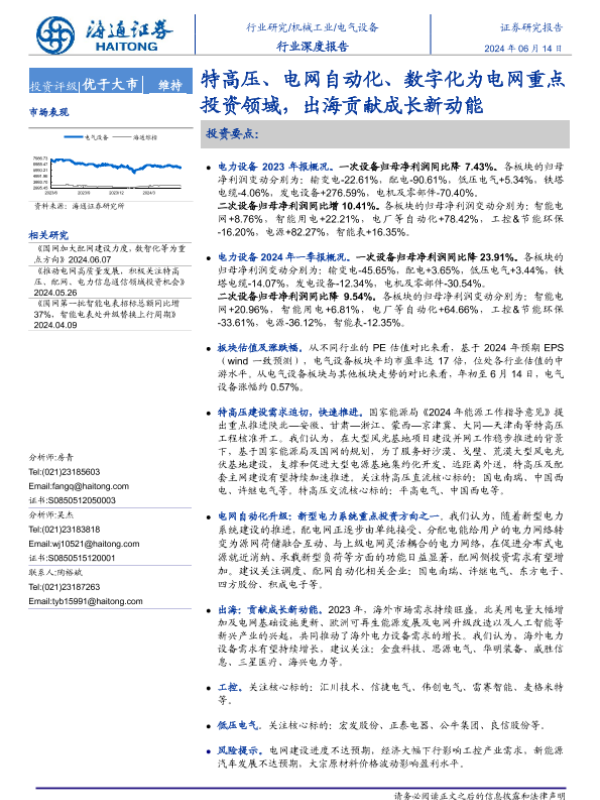 【海通证券】【20240614】电气设备行业深度报告:特高压、电网自动化、数字化为电网重点投资领域,出海贡献成长新动能-27页 行业研究