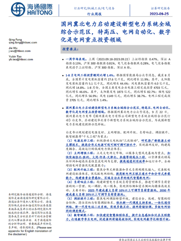 【海通国际】【20230925】20230925-海通国际-电气设备行业周报:国网冀北电力启动建设新型电力系统全域综合示范区,特高压、电网自动化、数字化是电网重点投资领域-10页 行业研究