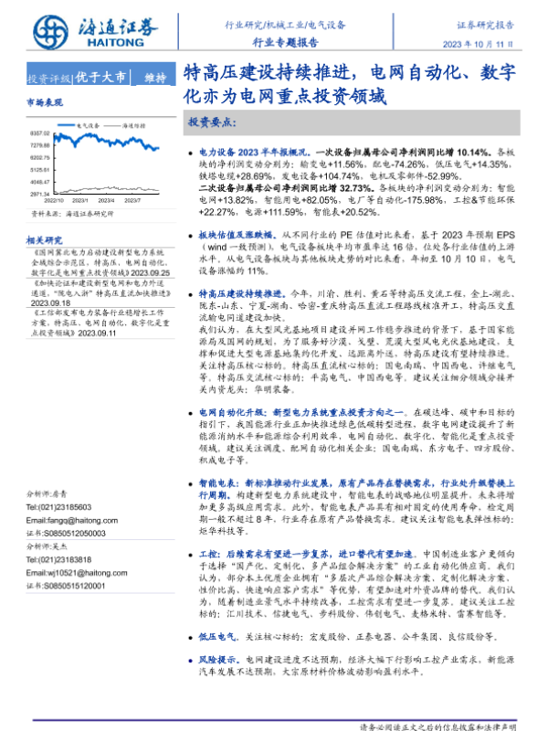 【海通证券】【20231011】20231011-海通证券-电气设备行业专题报告:特高压建设持续推进,电网自动化、数字化亦为电网重点投资领域-25页 行业研究