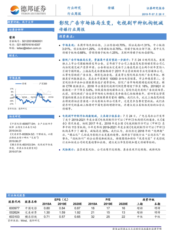【德邦证券】【20190728】20190728-德邦证券-传媒行业周报:影院广告市场格局生变,电视剧甲种机构锐减-3页 行业研究