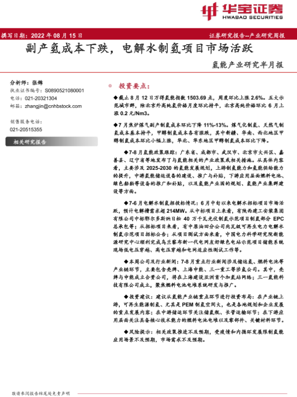 【华宝证券】【20220815】20220815-华宝证券-氢能产业研究半月报:副产氢成本下跌,电解水制氢项目市场活跃-7页 行业研究