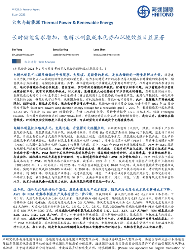 【海通国际】【20230108】长时储能需求增加,电解水制氢成本优势和环境效益日益显著-14页 行业研究