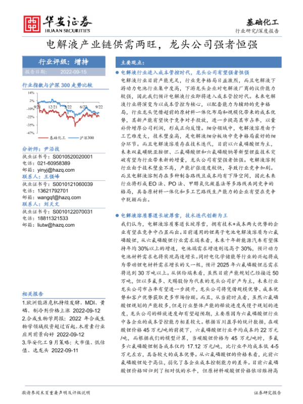 【华安证券】【20220915】基础化工行业深度报告:电解液产业链供需两旺,龙头公司强者恒强-86页 行业研究