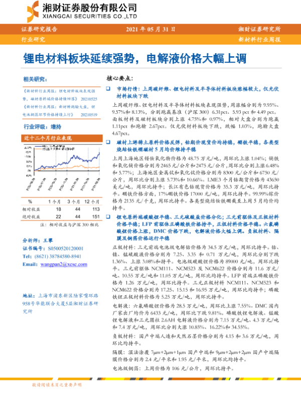 【湘财证券】【20210531】20210531-湘财证券-新材料行业周报:锂电材料板块延续强势,电解液价格大幅上调-12页 行业研究