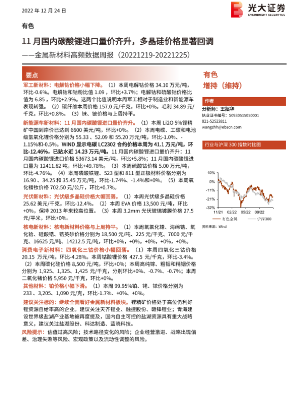 【光大证券】【20221224】20221224-光大证券-金属新材料高频数据周报:11月国内碳酸锂进口量价齐升,多晶硅价格显著回调-26页 行业研究