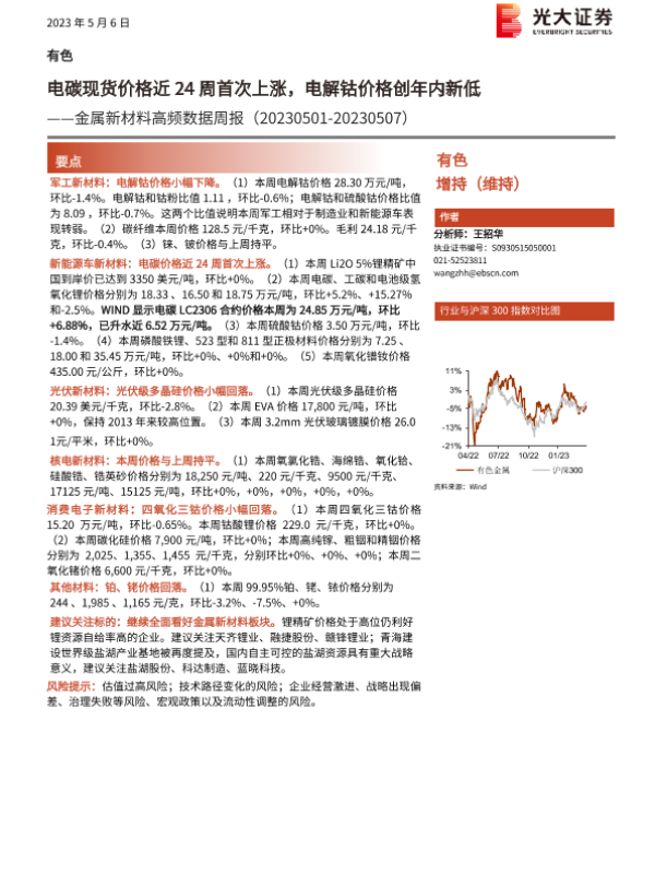 【光大证券】【20230506】20230506-光大证券-金属新材料高频数据周报:电碳现货价格近24周首次上涨,电解钴价格创年内新低-24页 行业研究