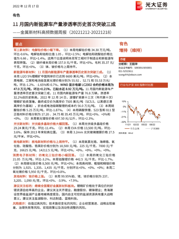 【光大证券】【20221217】20221217-光大证券-金属新材料高频数据周报:11月国内新能源车产量渗透率历史首次突破三成-26页 行业研究