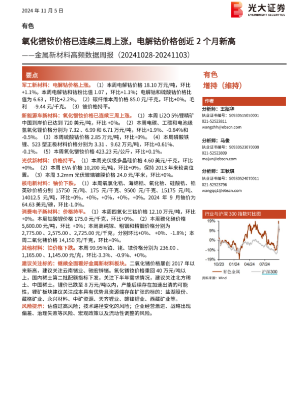 【光大证券】【20241105】金属新材料行业高频数据周报:氧化镨钕价格已连续三周上涨,电解钴价格创近2个月新高-24页 行业研究