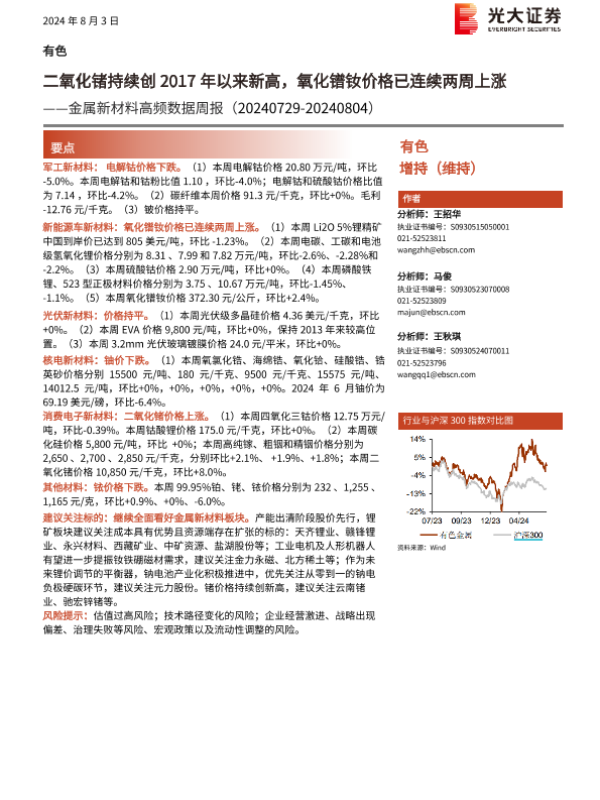 【光大证券】【20240803】20240803-光大证券-金属新材料高频数据周报:二氧化锗持续创2017年以来新高,氧化镨钕价格已连续两周上涨-22页 行业研究