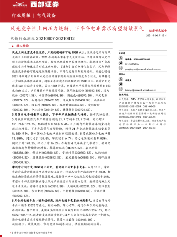 【西部证券】【20210612】电新行业周报:风光竞争性上网压力缓解,下半年电车需求有望持续景气-14页 行业研究