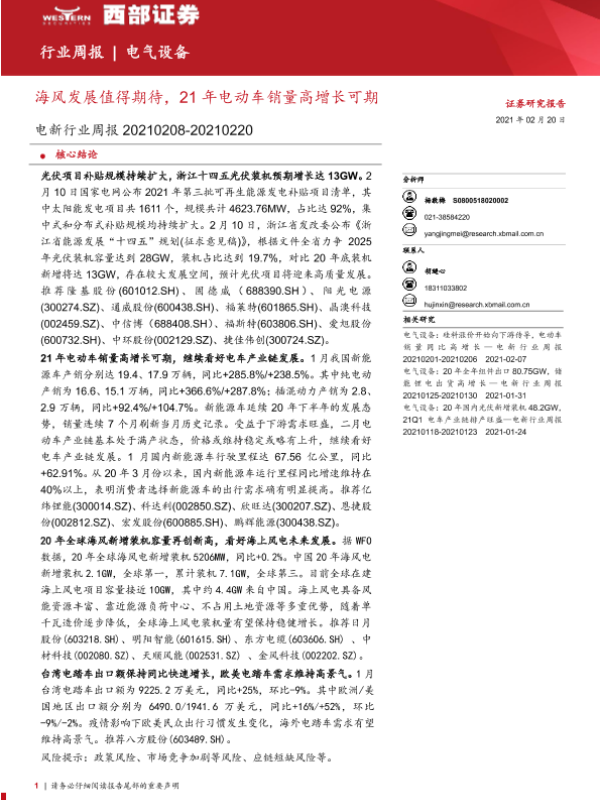【西部证券】【20210220】电新行业周报:海风发展值得期待,21年电动车销量高增长可期-11页 行业研究