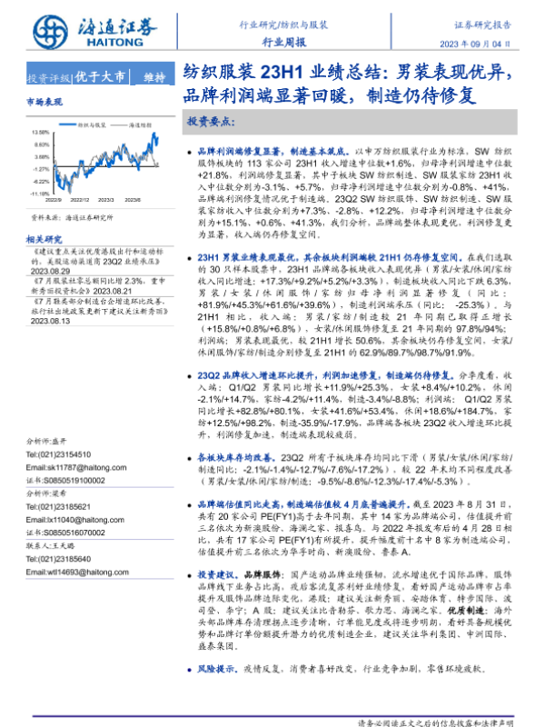 【海通证券】【20230904】20230904-海通证券-纺织服装23H1业绩总结:男装表现优异,品牌利润端显著回暖,制造仍待修复-11页 行业研究
