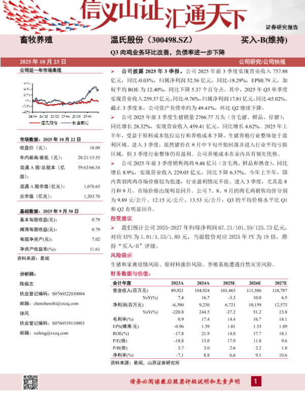 【山西证券】【202510】畜牧养殖 温氏股份(300498.SZ) 买入-B(维持) Q3肉鸡业务环比改善,负债率进一步下降-4页 证券期货研究报告