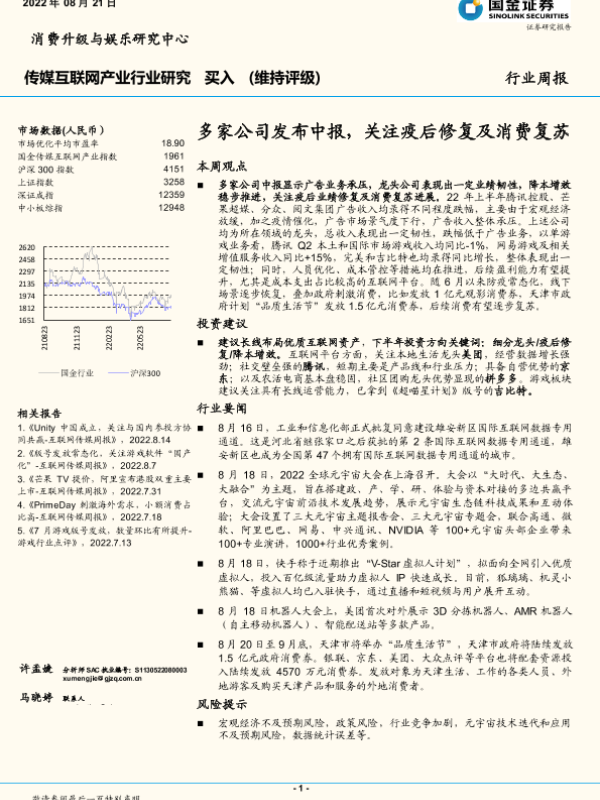【国金证券】【20220821】传媒互联网产业行业研究:多家公司发布中报,关注疫后修复及消费复苏-19页 行业研究