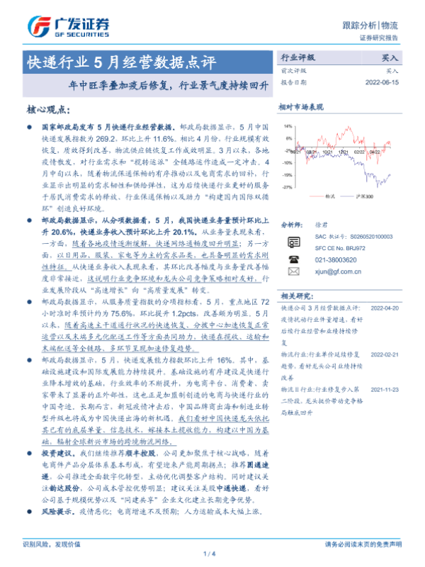 【广发证券】【20220615】快递行业5月经营数据点评-4页 行业研究