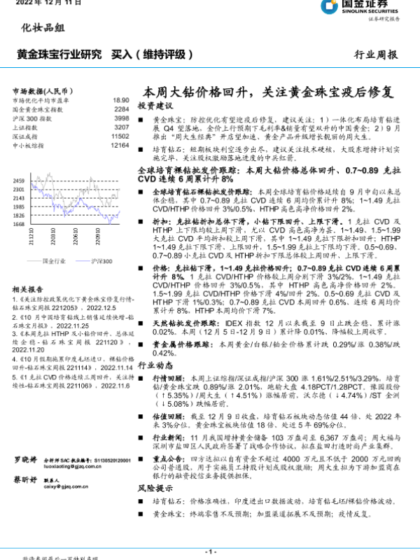 【国金证券】【20221211】20221211-国金证券-黄金珠宝行业研究:本周大钻价格回升,关注黄金珠宝疫后修复-17页 行业研究