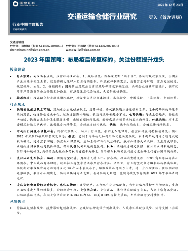【国金证券】【20221223】交通运输仓储行业研究:2023年度策略:布局疫后修复标的,关注份额提升龙头-37页 行业研究