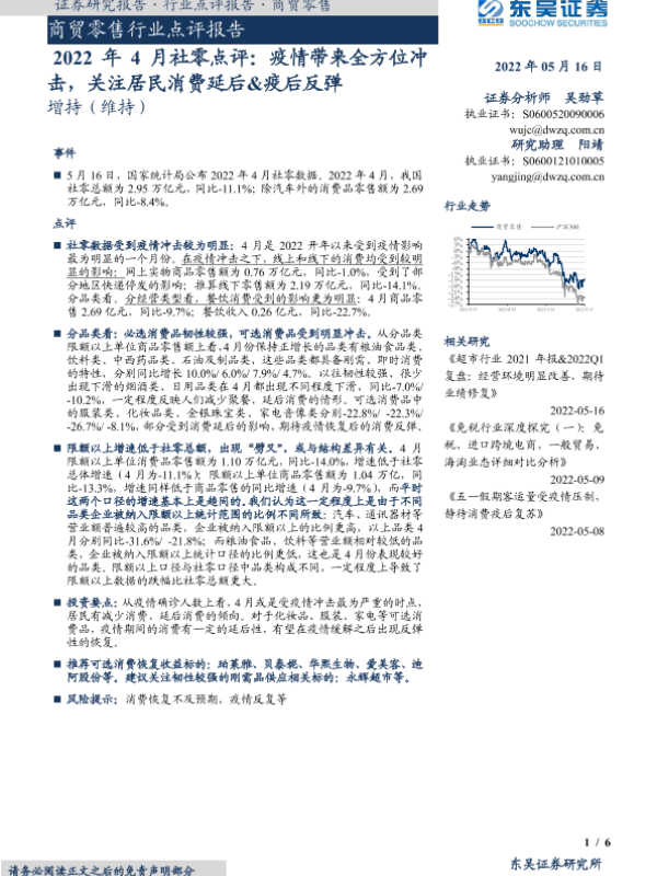 【东吴证券】【20220516】2022年4月社零点评:疫情带来全方位冲击,关注居民消费延后&疫后反弹-6页 行业研究