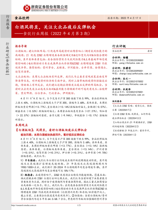 【浙商证券】【20220417】食饮行业周报(2022年4月第3期):白酒风将至,关注大众品疫后反弹机会-21页 行业研究
