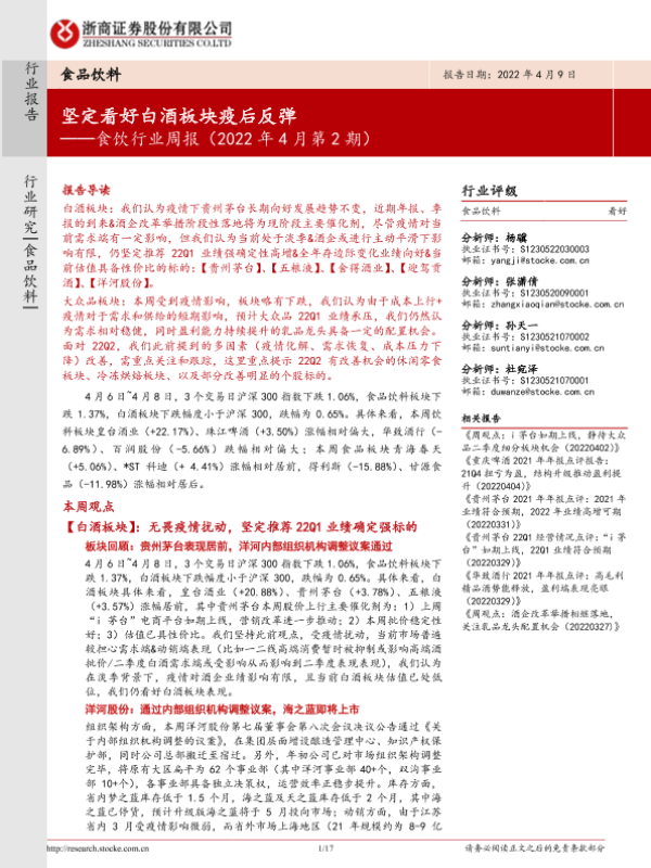 【浙商证券】【20220409】食饮行业周报(2022年4月第2期):坚定看好白酒板块疫后反弹-17页 行业研究