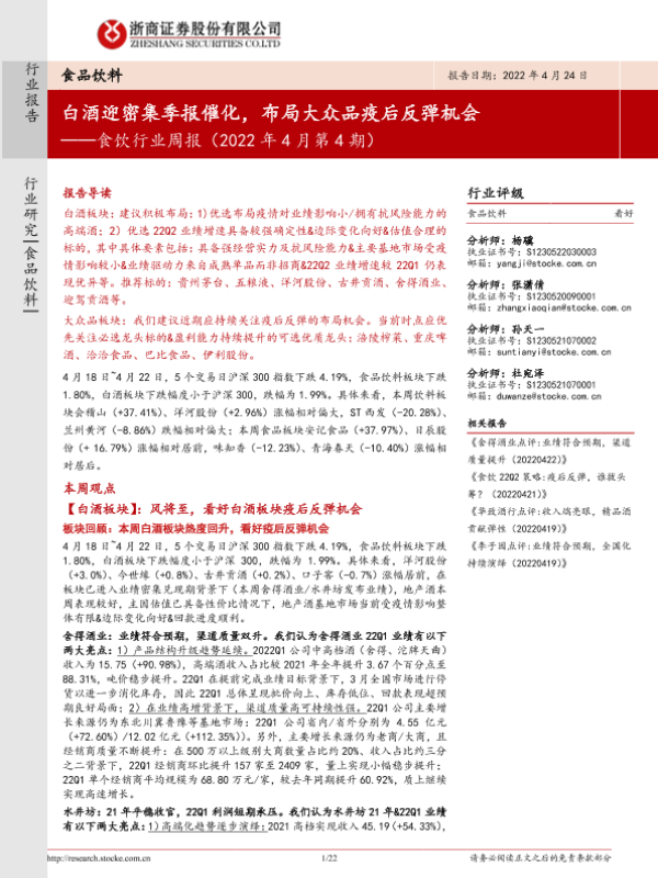 【浙商证券】【20220424】食饮行业周报(2022年4月第4期):白酒迎密集季报催化,布局大众品疫后反弹机会-22页 行业研究