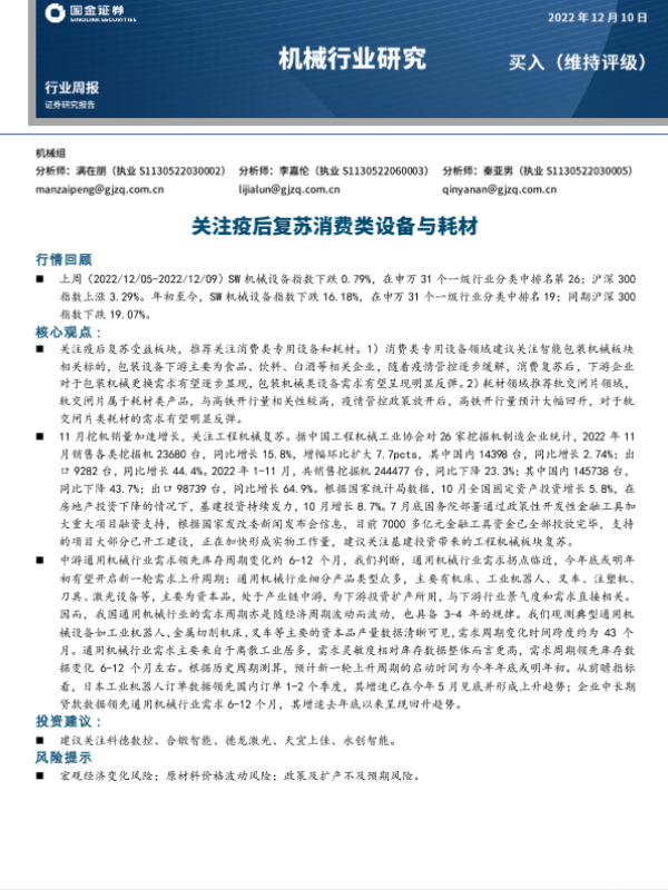 【国金证券】【20221210】20221210-国金证券-机械行业研究:关注疫后复苏消费类设备与耗材-17页 行业研究