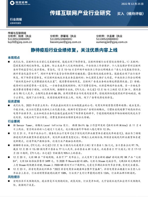 【国金证券】【20221225】传媒互联网产业行业研究:静待疫后行业业绩修复,关注优质内容上线-17页 行业研究