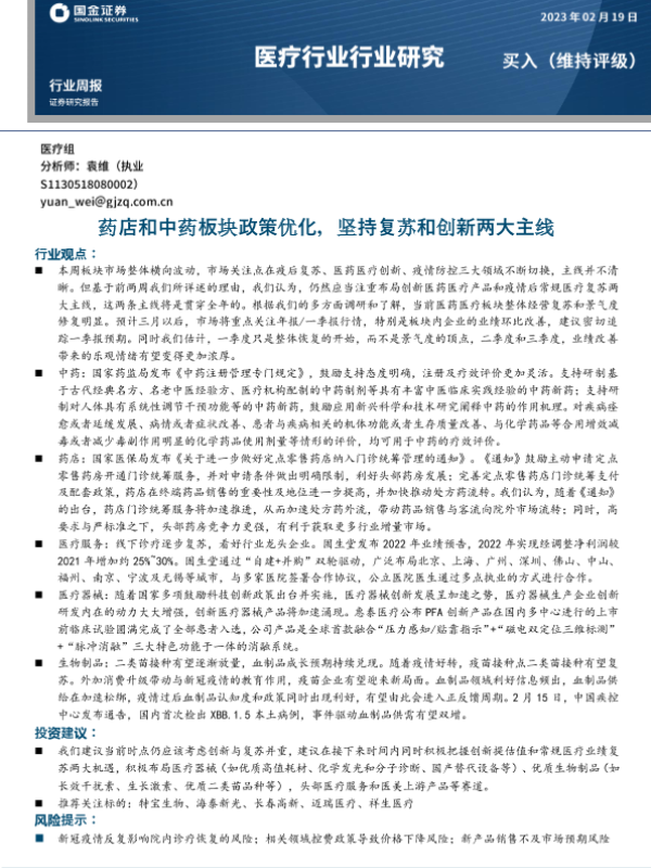【国金证券】【20230219】医疗行业行业研究:药店和中药板块政策优化,坚持复苏和创新两大主线-10页 行业研究