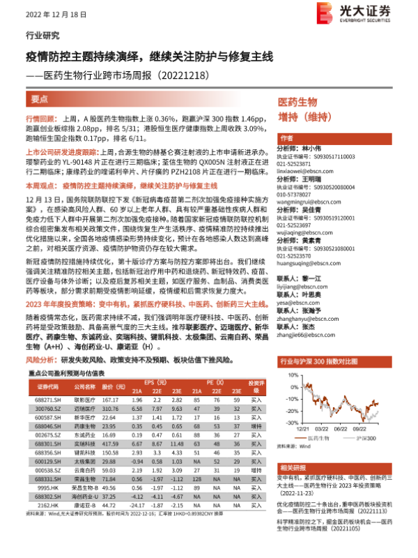 【光大证券】【20221218】医药生物行业跨市场周报:疫情防控主题持续演绎,继续关注防护与修复主线-23页 行业研究