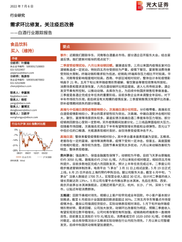 【光大证券】【20220706】20220706-光大证券-白酒行业跟踪报告:需求环比修复,关注疫后改善-4页 行业研究