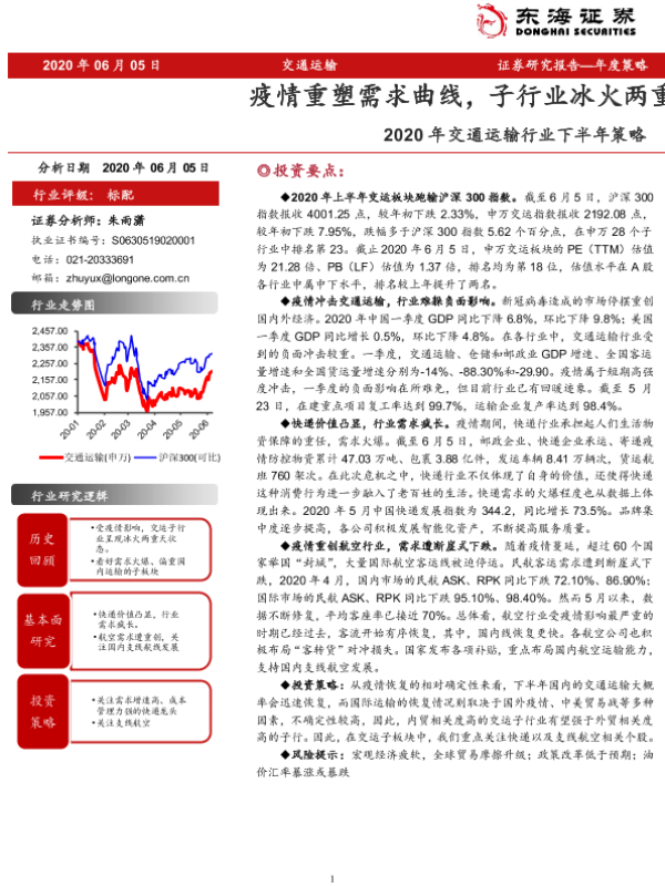 【东海证券】【20200605】2020年交通运输行业下半年策略:疫情重塑需求曲线,子行业冰火两重天-27页 行业研究