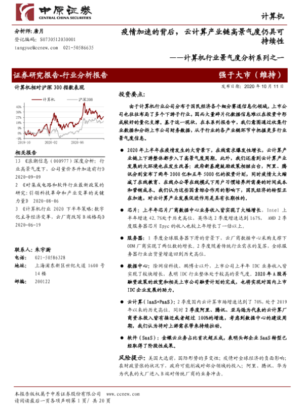 【中原证券】【20201011】20201011-中原证券-计算机行业景气度分析系列之一:疫情加速的背后,云计算产业链高景气度仍具可持续性-20页 行业研究