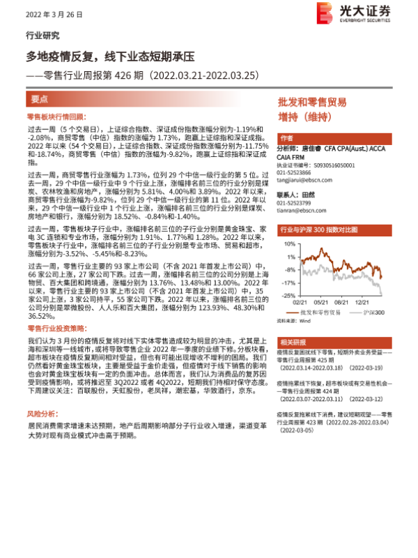 【光大证券】【20220326】零售行业周报第426期:多地疫情反复,线下业态短期承压-8页 行业研究