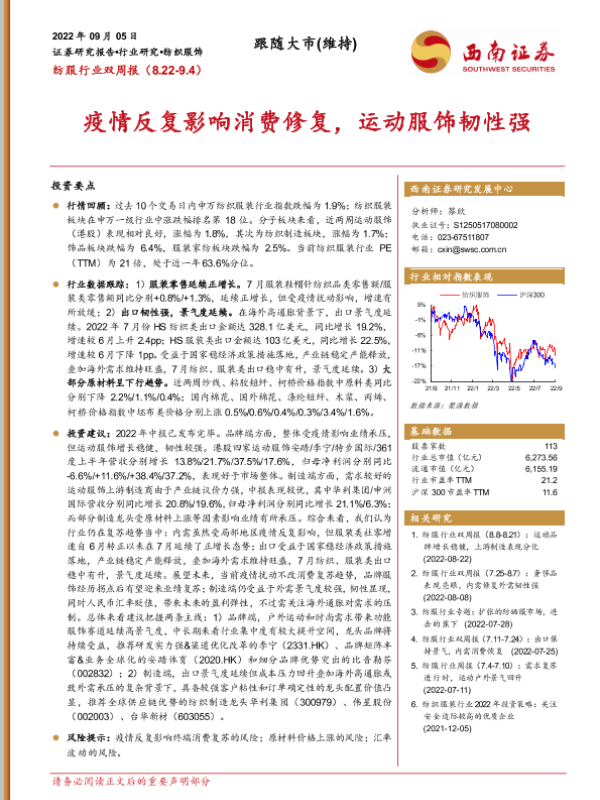 【西南证券】【20220905】20220905-西南证券-纺服行业双周报:疫情反复影响消费修复,运动服饰韧性强-13页 行业研究