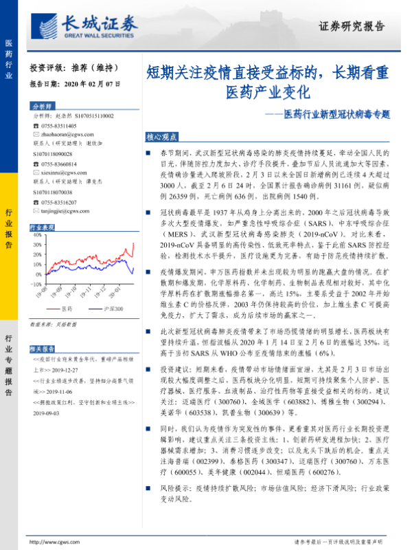 【长城证券】【20200207】医药行业新型冠状病毒专题:短期关注疫情直接受益标的,长期看重医药产业变化-21页 行业研究