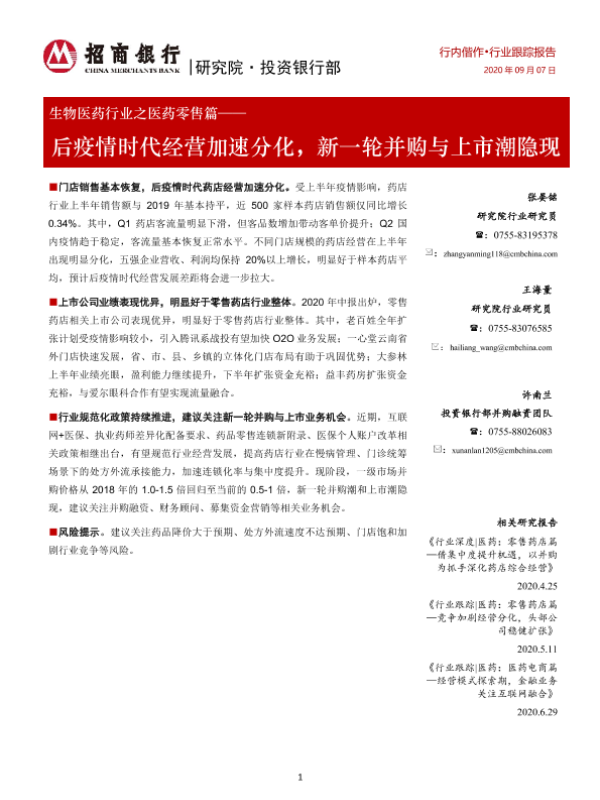 【招商银行】【20200907】生物医药行业之医药零售篇:后疫情时代经营加速分化,新一轮并购与上市潮隐现-19页 行业研究