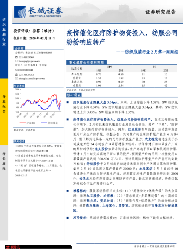 【长城证券】【20200211】20200211-长城证券-纺织服装行业2月第一周周报:疫情催化医疗防护物资投入,纺服公司纷纷响应转产-21页 行业研究