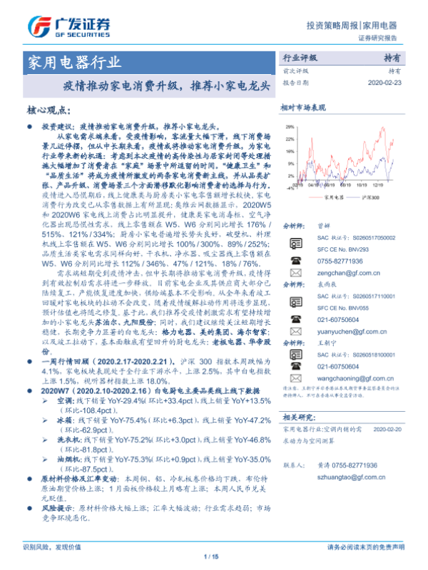 【广发证券】【20200223】20200223-广发证券-家用电器行业投资策略周报:疫情推动家电消费升级,推荐小家电龙头-15页 行业研究