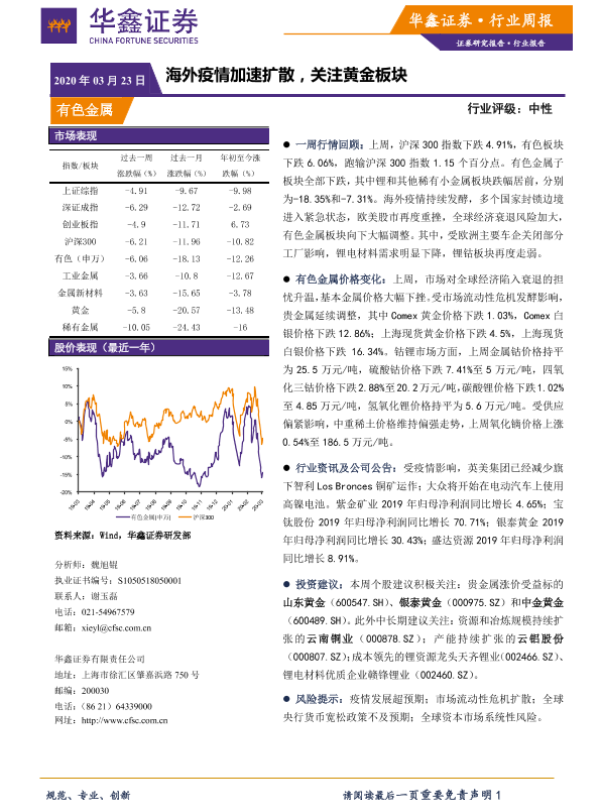 【华鑫证券】【20200323】20200323-华鑫证券-有色金属行业周报:海外疫情加速扩散,关注黄金板块-12页 行业研究