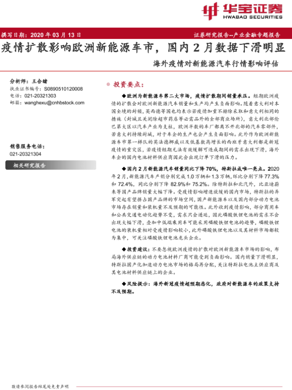 【华宝证券】【20200313】海外疫情对新能源汽车行情影响评估:疫情扩散影响欧洲新能源车市,国内2月数据下滑明显-11页 行业研究
