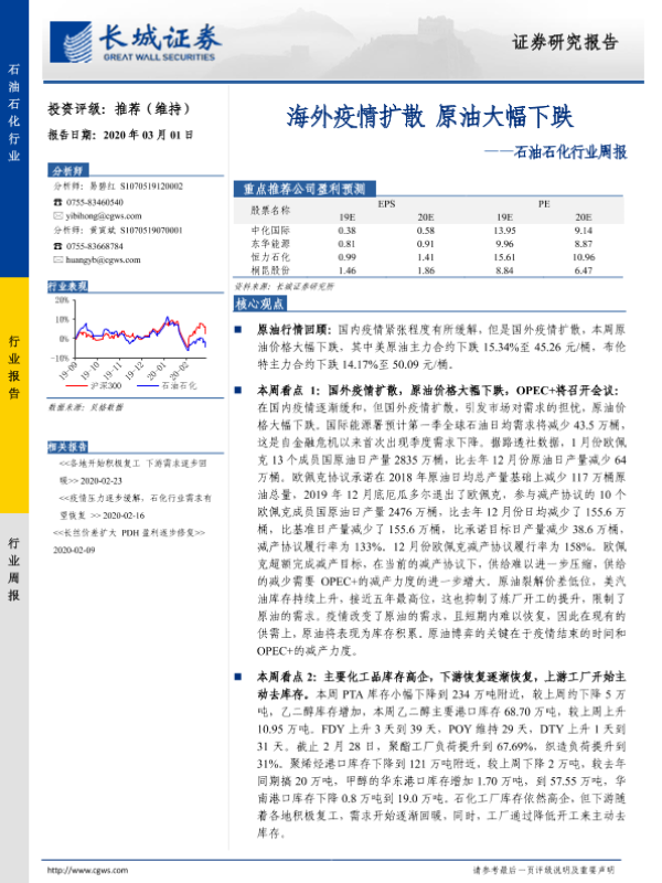 【长城证券】【20200301】石油石化行业周报:海外疫情扩散 原油大幅下跌-10页 行业研究