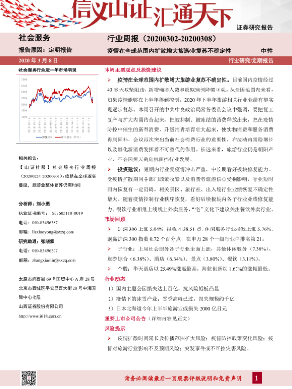 【山西证券】【20200308】社会服务行业周报:疫情在全球范围内扩散增大旅游业复苏不确定性-9页 行业研究